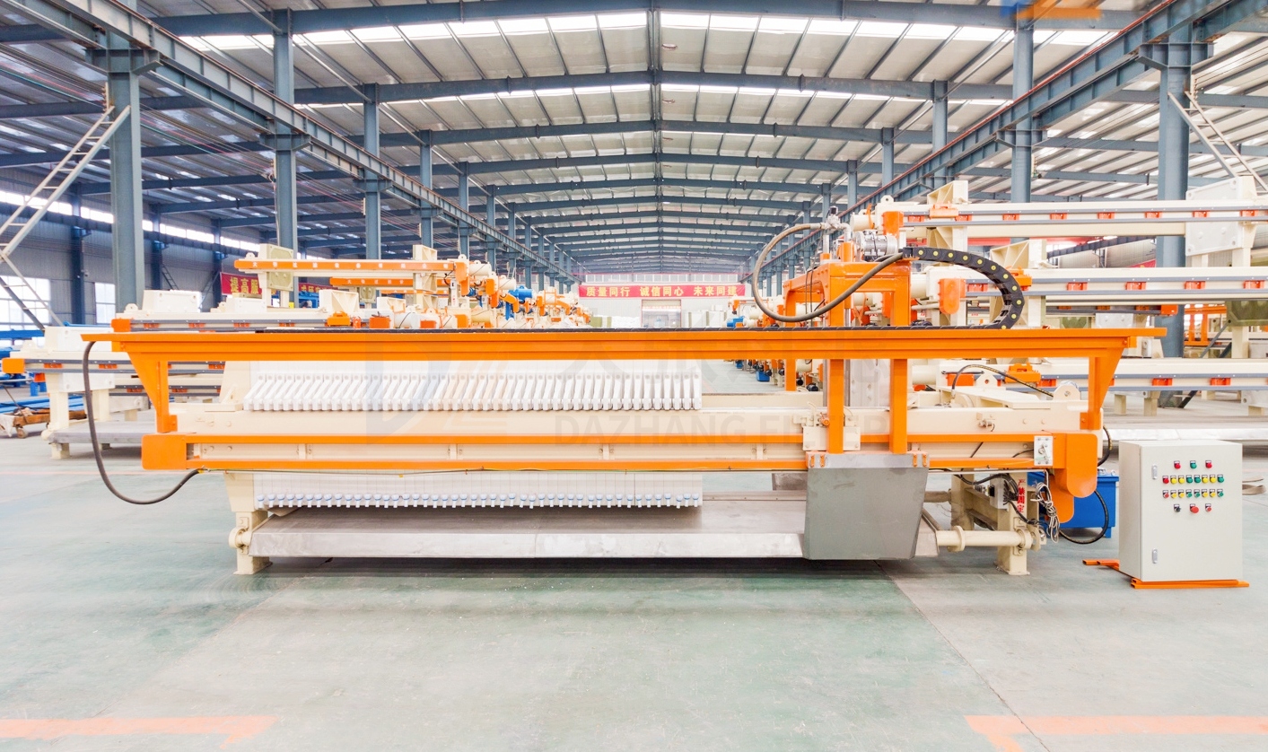 高效節(jié)能壓濾機是在自動拉板壓濾機基礎(chǔ)上增加更換了機械手,加長了油缸,增加了區(qū)間,一次拉開多塊濾板卸料。
